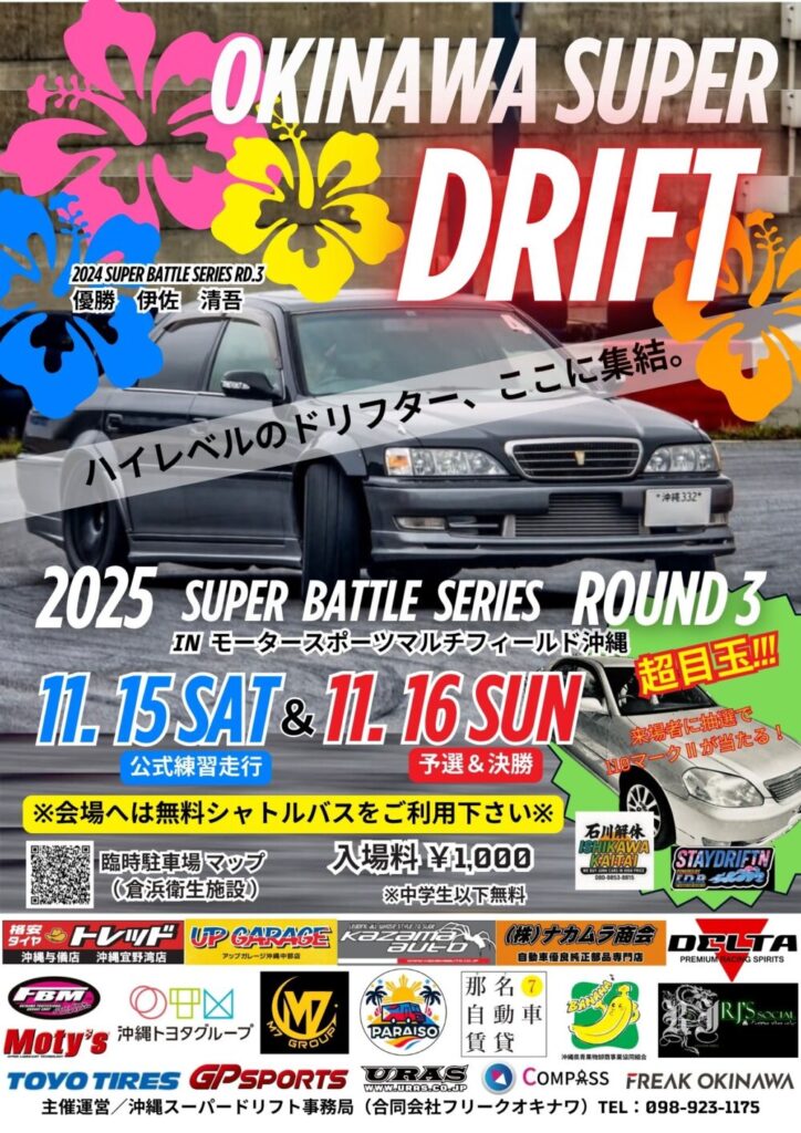 主催:合同会社フリークオキナワ 開催日:2025年11月15日(土)&16(日) 場所:モータースポーツマルチフィールド沖縄 開催時間:午前 9:00 ~ 午後 16:00 入場料¥1,000(中学生以下無料) ※臨時